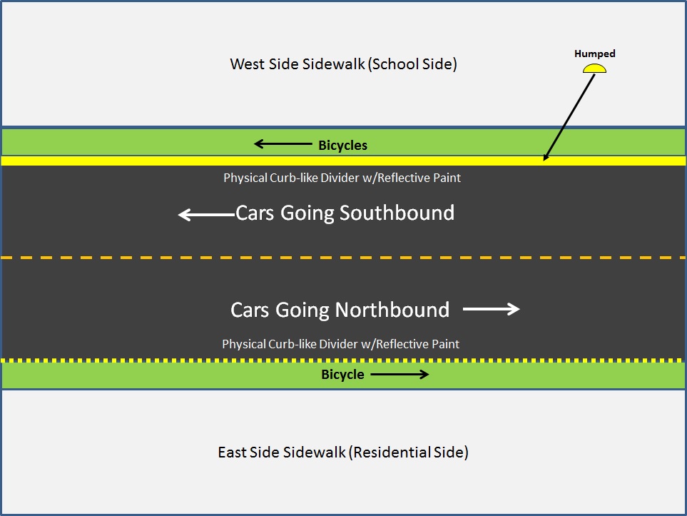 A longitudinal semi-round humped strip about 6-8 inches wide and 3 inches high could line the Southbound side (School Side) of the road with no parking on that side of the road but allowing garbage truck to run over. This hump will be felt by a car wandering into the bicycle land and bicycles wandering into the car lane. Trash bins can be places on the edge of the curb instead of the street.