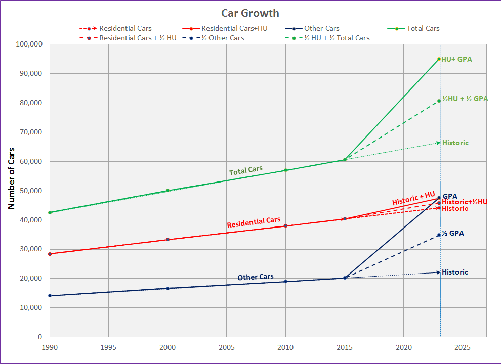The Total Cars is the graph of the total of the Residential Car and the Other Cars curve. In 2015 the total number of cars was 60,615 but only 8 years later the total number of cars will increase to 95,089 and increase of 34,474 cars, more than half the total number of cars that exist today. It can clearly be seen the unprecedented explosion of car growth due to the GP Office Space. Even reducing the growth of Other Cars and HU by half (conservative case) results in a total of 80,739 cars or an increase of 20,124 car is still hugely significant. Such growth in the rate of cars is UNSUSTAINABLE.